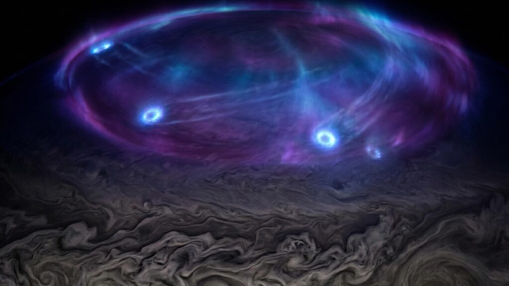 ガリレオ衛星であるイオやエウロパが木星の強力な磁場と干渉することで生じる「オーロラル・フットプリント(足跡)」が、これまでにない解像度で描写されている。