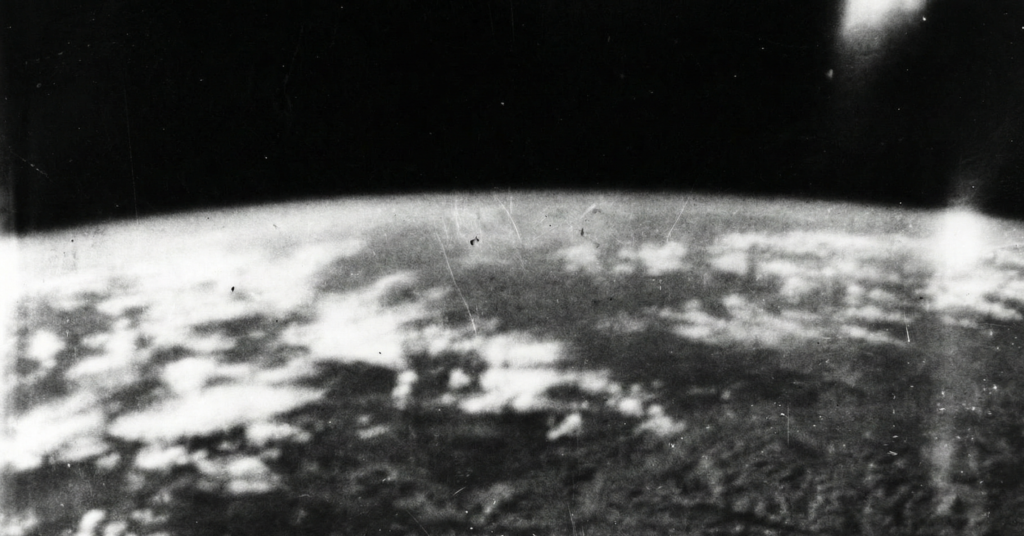 1946年から始まったV2の発射実験は、軍事的なデータ収集が主目的でしたが、同時に科学的な偉業も成し遂げられました。 1946年10月24日、V2ロケットの13号機が高度105km(宇宙空間の定義とされるカーマン・ラインを超えた高さ)に到達。搭載されていた35ミリカメラが、人類史上初めて「宇宙から見た地球」の撮影に成功したのです。 現像されたモノクロ写真には、漆黒の宇宙を背景に、白く輝く雲と湾曲した地平線が写っていました。それは、人類が初めて自らの住む星を「外側」から客観視した瞬間でした。