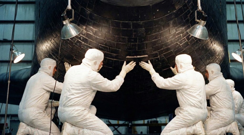宇宙に行ける実機「コロンビア号」の建造は難航を極めました。 最大の問題は、機体を覆う3万枚以上の「耐熱タイル」でした。大気圏再突入時の1,500度以上の熱からアルミ合金の機体を守るこのタイルは、発泡スチロールのように軽く、しかし非常に脆い素材でした。 ちょっとした衝撃で割れ、接着剤が合わなければポロポロと剥がれ落ちる。技術者たちは、3万枚のタイルをまるでジグソーパズルのように手作業で貼り付ける作業に忙殺されました。