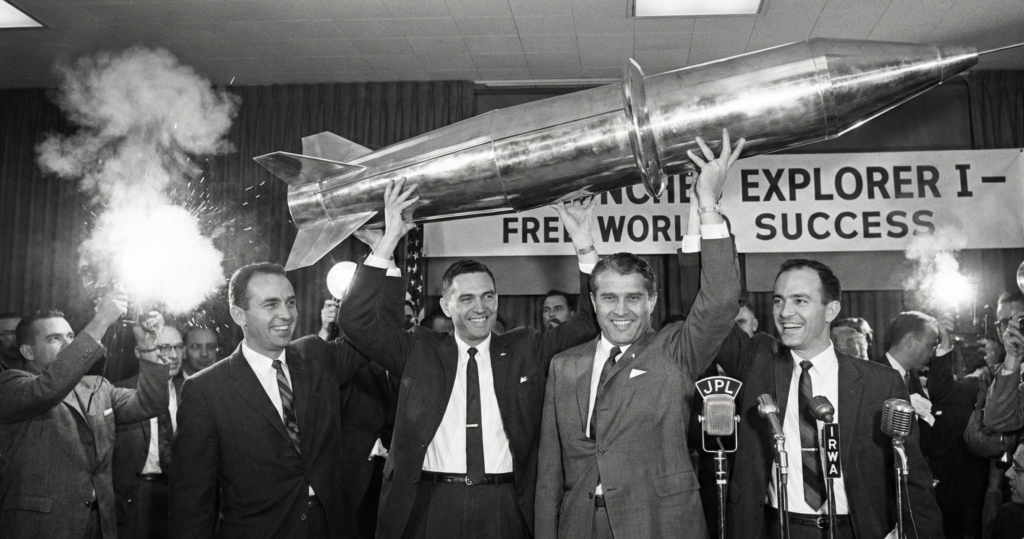 そして1958年1月31日。バンガードの失敗からわずか56日後。 フォン・ブラウンたちのロケット「ジュピターC」は、アメリカ初の人工衛星「エクスプローラー1号」を夜空へと運び去りました。 「ゴールドストーン通信局、感あり!」 衛星からの信号が確認された瞬間、管制室は歓喜に包まれました。フォン・ブラウンが掲げた衛星の模型とともに満面の笑みを浮かべる写真は、アメリカがようやく自信を取り戻した瞬間として有名です。